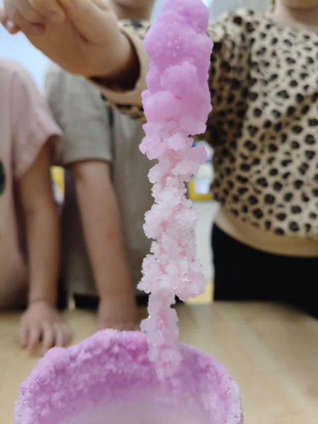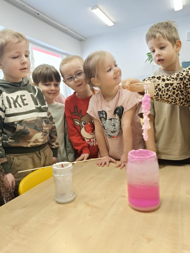 Dzieci z grupy Żółwików przeprowadziły ciekawy eksperyment. Przygotowały dwa roztwory: wodę z solą i barwnikiem oraz wodę z solą bez dodatku barwnika. W obu przypadkach do naczyń zanurzona została włóczka. Z czasem dzieci mogły zaobserwować proces krystalizacji soli oraz zauważyć różnice w wyglądzie powstałych kryształków. Eksperyment wzbudził duże zainteresowanie i pozwolił Żółwikom w atrakcyjny sposób poznać zjawiska zachodzące w przyrodzie.